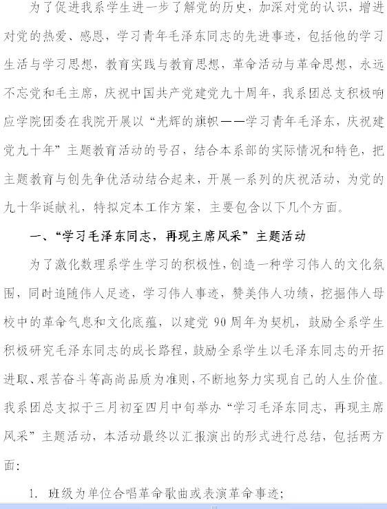 数理系团总支关于“光辉的旗帜--学习青年毛泽东,庆祝建党九十年”主题教育活动的方案
