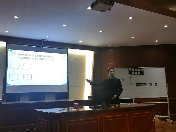 比赛开始,12位参赛选手根据抽签顺序依次上台进行展示。选手们在规定时间内,运用所学知识,结合自身对小学数学课程标准的理解,向在场老师和同学展示着自己的风采。其中2018级774数学班龚子茜讲授的《梯形的面积》,以深受学生喜爱的动画片为背景,趣味生动,层层深入,引导学生自主探索梯形的面积计算公式,展现了扎实的教学基本功;18级777班张宏涛讲授的《平行四边形的面积》,详略得当,重点突出,教态大方得体,赢得掌声不断。