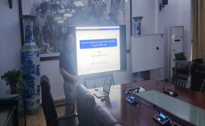 黄荣做了题为“Accurate computation of generalized eigenvalues of regular SR-BP pairs”的学术报告,他介绍了高精度算法的研究现状、算法设计要求,以及如何利用矩阵分解技巧实现正则SR-PR矩阵组的广义特征值的高精度算法设计方法,并通过扰动分析和数值实验展示了算法的高精确性。黄荣教授还介绍了针对几类特殊符号规则矩阵的特征值和奇异值的高精度计算算法,这些工作得到了国内外同行的高度评价。通过黄荣的报告,与会师生们对高精度算法有了更深入的了解。