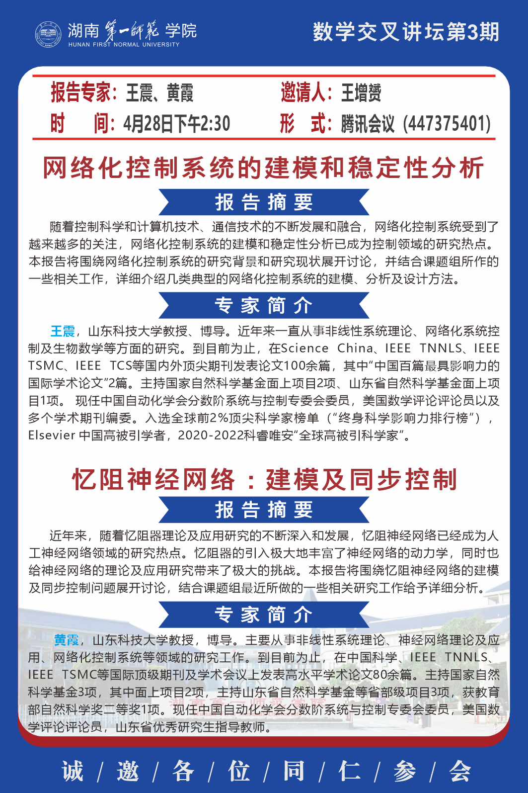 学术报告|数学交叉讲坛第3期:网络化控制系统的建模和稳定性分析;忆阻神经网络:建模及同步控制