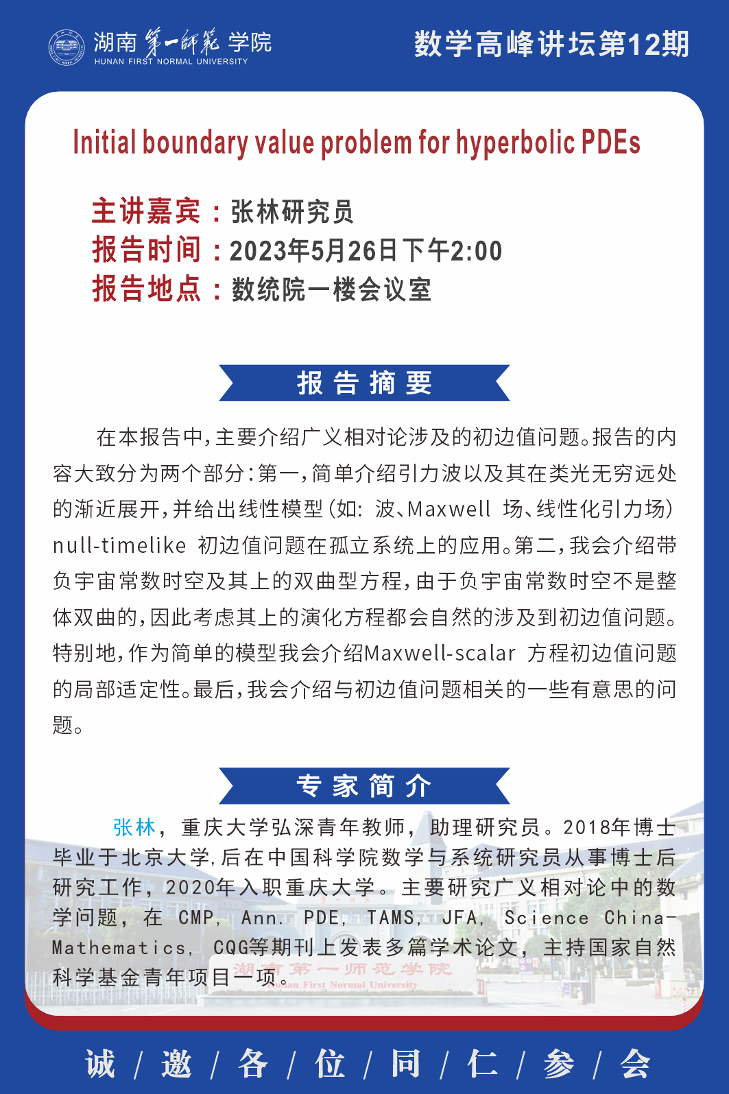 学术报告|数学高峰讲坛第12期:Initial boundary value problem for hyperbolic PDEs