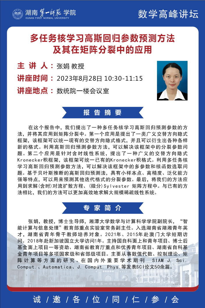 学术报告|数学高峰讲坛第18期:多任务核学习高斯回归参数预测方法及其在矩阵分裂中的应用