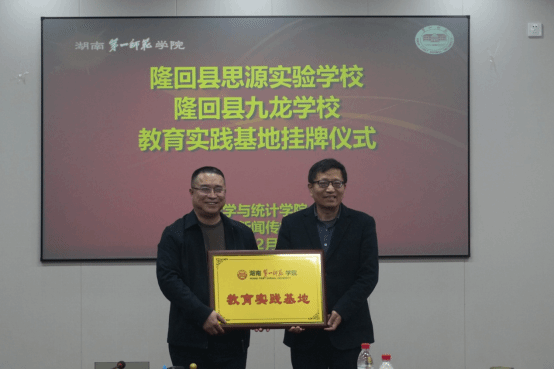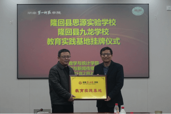 我院副院长王增赟从历史沿革、党建特色、师资队伍、专业建设、人才培养等七个方面详细介绍了我院基本情况,获得隆回县思源实验学校和隆回县九龙学校领导们的好评。我院党委书记阮东彪分别与隆回县思源实验学校党总支书记丁加健、隆回县九龙学校校长陈玲华签署了教育实习实践基地协议并举行了隆重的授牌仪式。整个活动愉快和谐,最后在热烈的掌声中结束。