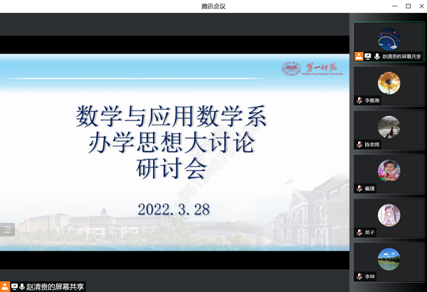 为落实学校第二次党代会精神和2022年学校工作会议精神,进一步深化教育教学综合改革,充分激发和调动办学要素活力,3月28日晚上,我院数学与应用数学系在线上开展了“新时代 新师范 新使命”办学思想大讨论活动,学院副院长李雅湘和数学与应用数学系全体教师参与本次活动,会议由数学与应用数学系主任赵清贵主持。