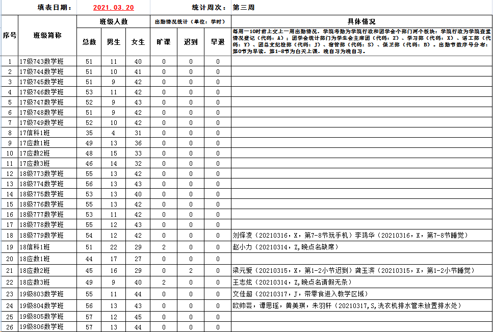 数学与计算科学学院2020-2021学年第二学期第三周考勤表