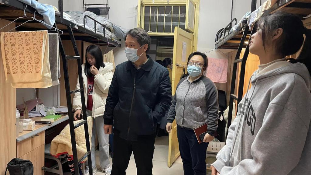 随后,一行人来到学生三四栋寝室,深入了解近期同学们日常学习和生活的情况,要求同学们保持寝室卫生整洁,开窗通风,做好消毒工作,同时,积极倡导健康饮食,积极锻炼,做好疫情防护,坚决做到进教室、进寝室,进食堂时时佩戴口罩,防疫要求时时记在心中。