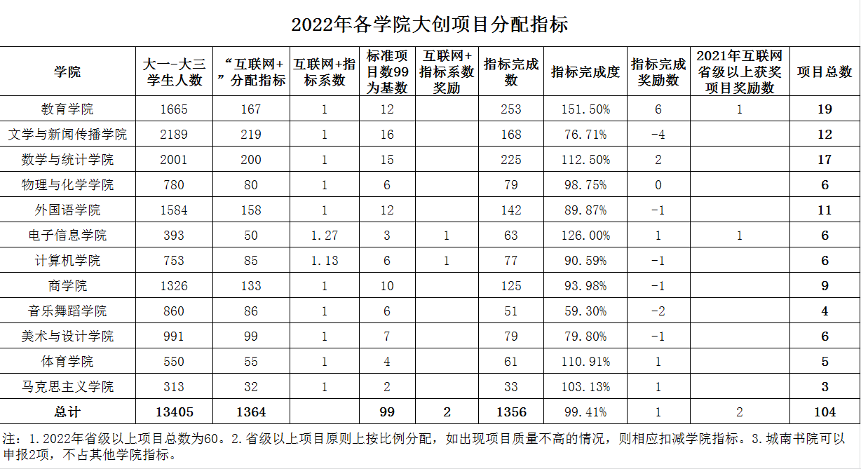 注:1.各学院大创项目分配名额以525日“全国大学生创业服务网”创业项目申报成功的有效项目数据核算为准。2.互联网+项目的申报截止日期为624日,请各学院继续组织学生做好申报工作,此阶段所完成的项目申报数将作为下一年度“大创项目”分配的依据之一。