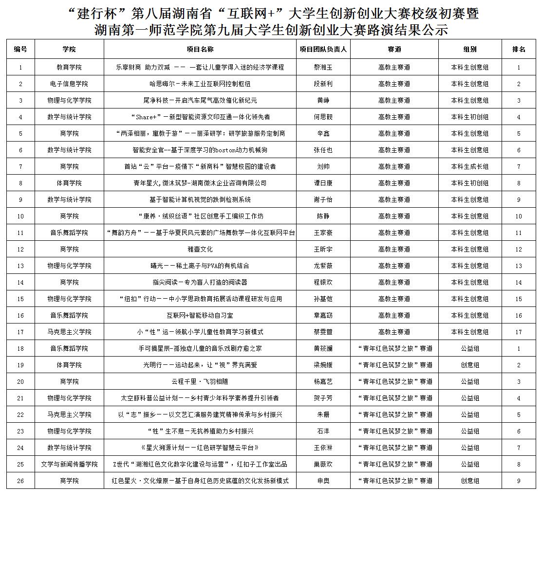 附件:“建行杯”第八届湖南省“互联网+”大学生创新创业大赛校级初赛暨湖南第一师范学院第九届大学生创新创业大赛路演结果公示