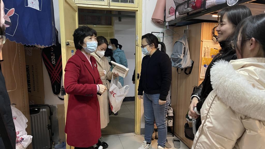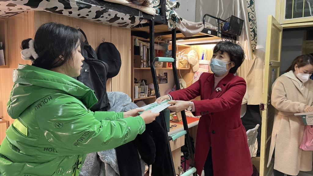 寝室内,校长童小娇亲自为学生发放个人防疫物资,询问同学们在疫情防控机制下的学习生活情况,确保疫情防控工作落到实处。她强调,防疫工作目前是“战时状态”,同学一定要绷紧神经,坚持做好个人防疫工作。认真学习《湖南第一师范学院疫情防控工作从严从实从细实施细则》,了解学校的防疫规定。面对疫情,让我们携起手来,共克时艰,早日战胜疫情。