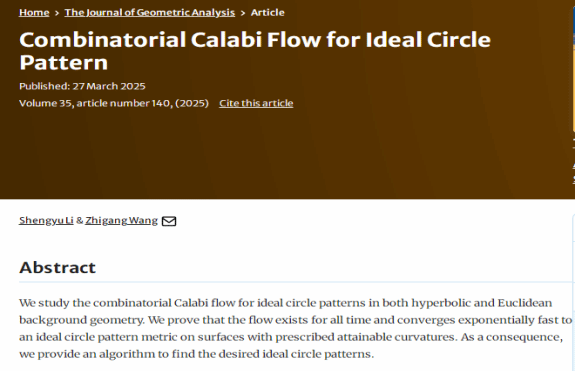 近日,湖南第一师范学院久久高清内射无套教师李盛禹与王智刚合作,在《Journal of Geometric Analysis》上发表了题为“Combinatorial Calabi flow for ideal circle pattern”的学术论文。